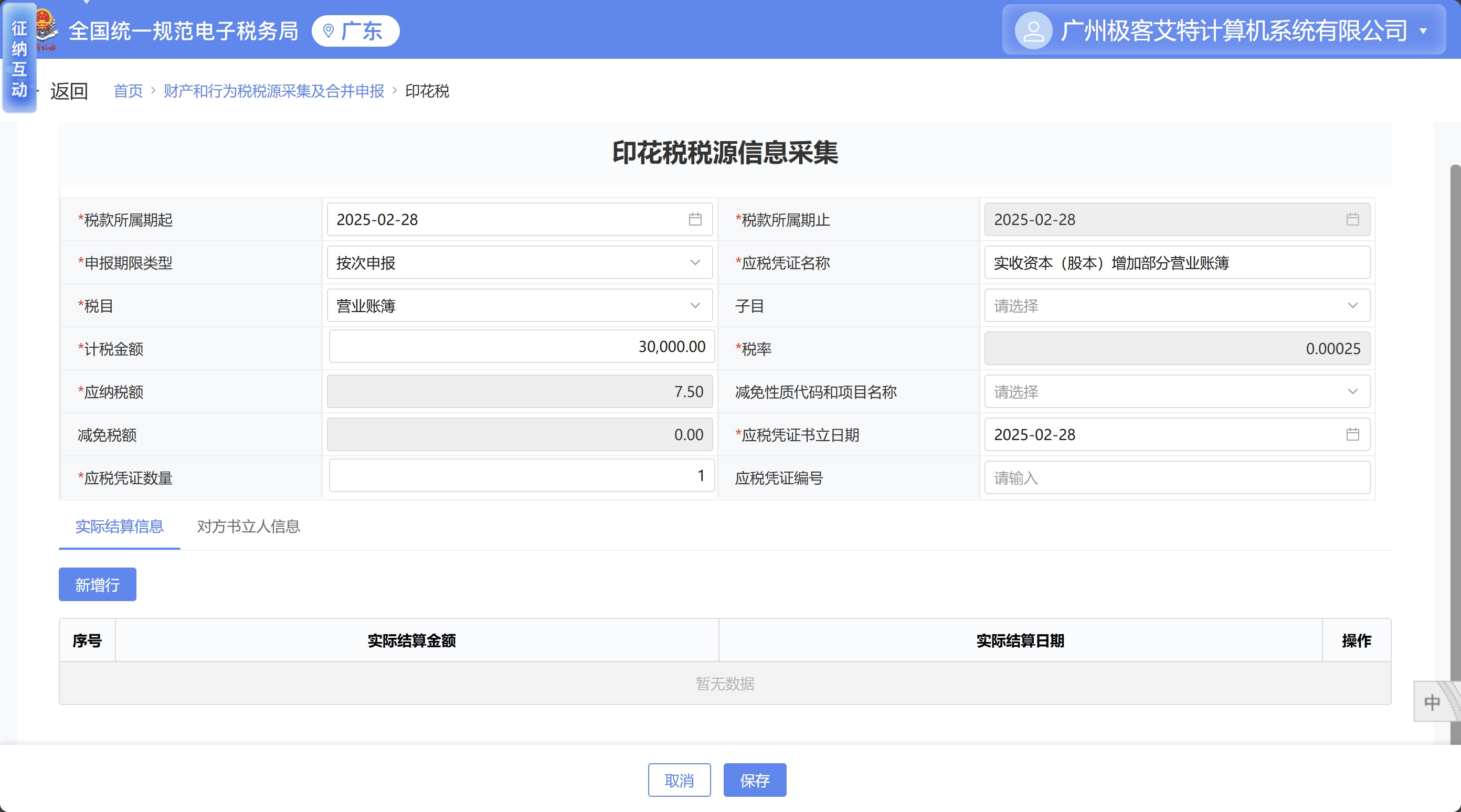 税目选择【营业账簿】,应税凭证名称填写【实收资本(股本)增加部分营业账簿】,填写应税凭证书立日期、计税金额等税源信息(带*的为必填项目),完成后点击【保存】。按提示进行提交、缴费即可。